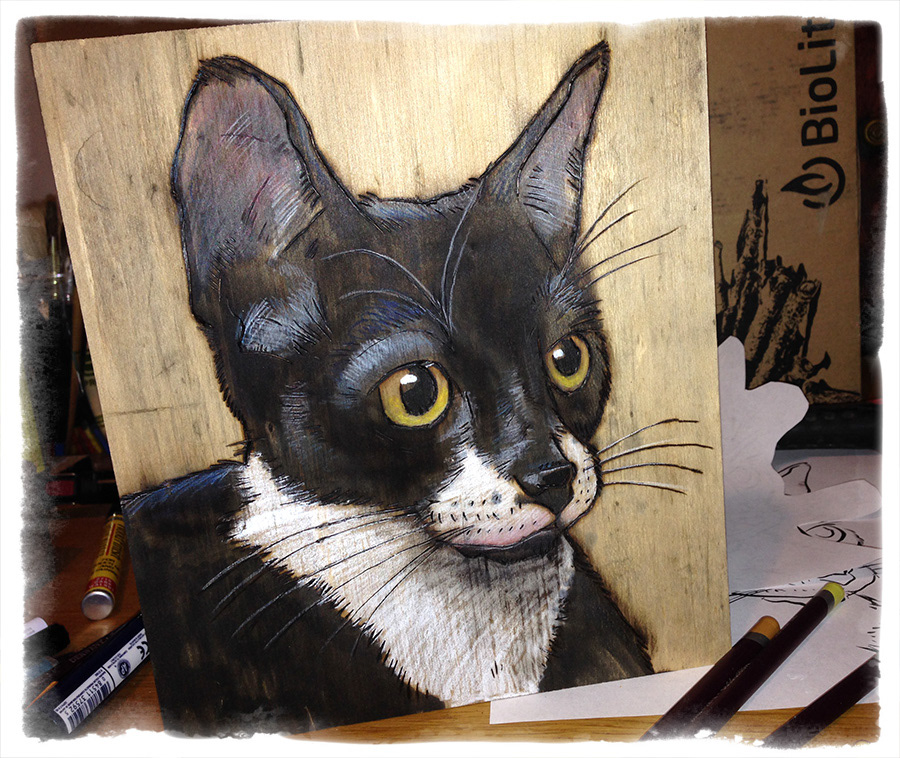 Etsy commissions and personal projects. Woodburning on reclaimed wood with stains, colored pencils, mixed media. Purchase at woundedwood.etsy.com